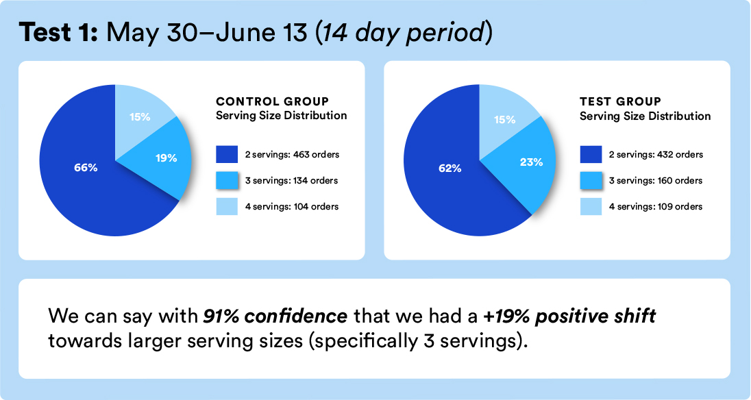 We learned more about our users tolerance to dynamic content. This gave the product and creative teams more room to plan for personalized dynamic content in the future. From our analytics and research, we gained the insight that showcasing our serving size capabilities did infact shift the type of customer that was converting from a propspect[1] to a new user.